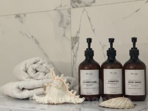 (зубные щётки и паста, мицелярная вода, тапочки, мыло, лосьн, гель для душа, шампунь, бальзам для волос).