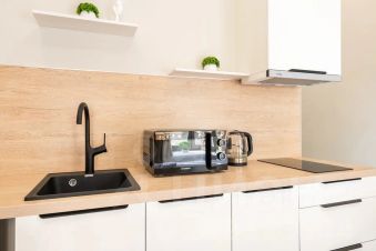 Апартаменты укомплектованы электрической плитой, стиральной машиной, чайником, телевизором, холодильником, феном, утюгом и микроволновкой.
