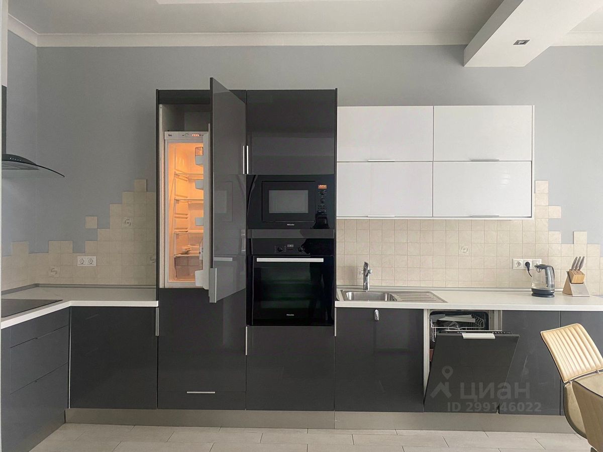 Кухня-гостиная оснащена необходимой техникой: встроенный холодильник, варочная поверхность, вытяжка, духовой шкаф MIELE, микроволновая печь MIELE, ПММ BOSH.