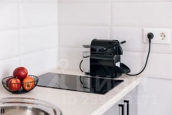 Вся необходимая бытовая техника: варочная панель, микроволновка, холодильник, чайник, стиральная машина, кофемашина Nespresso.
