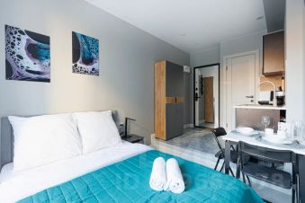 Студия находится в пешей доступности от метро "Молодежная". До центра Москвы 20 минут на метро. Рядом расположены круглосуточные магазины, кафе и рестораны.