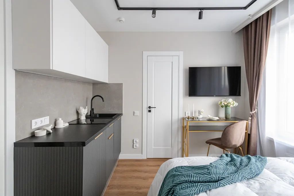 Большие окна. Качественная дорогая мебель и техника. Интерьер продуман до мелочей. Студия, откуда не хочется уезжать.