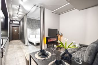 Апартаменты подходят для проживания 4 гостей. Двуспальная кровать и телевизор со SMART TV отделены с помощью текстиля от остального пространства. В зоне гостиной располагается двуспальный диван, телевизор со SMART TV, камин и столовый уголок.