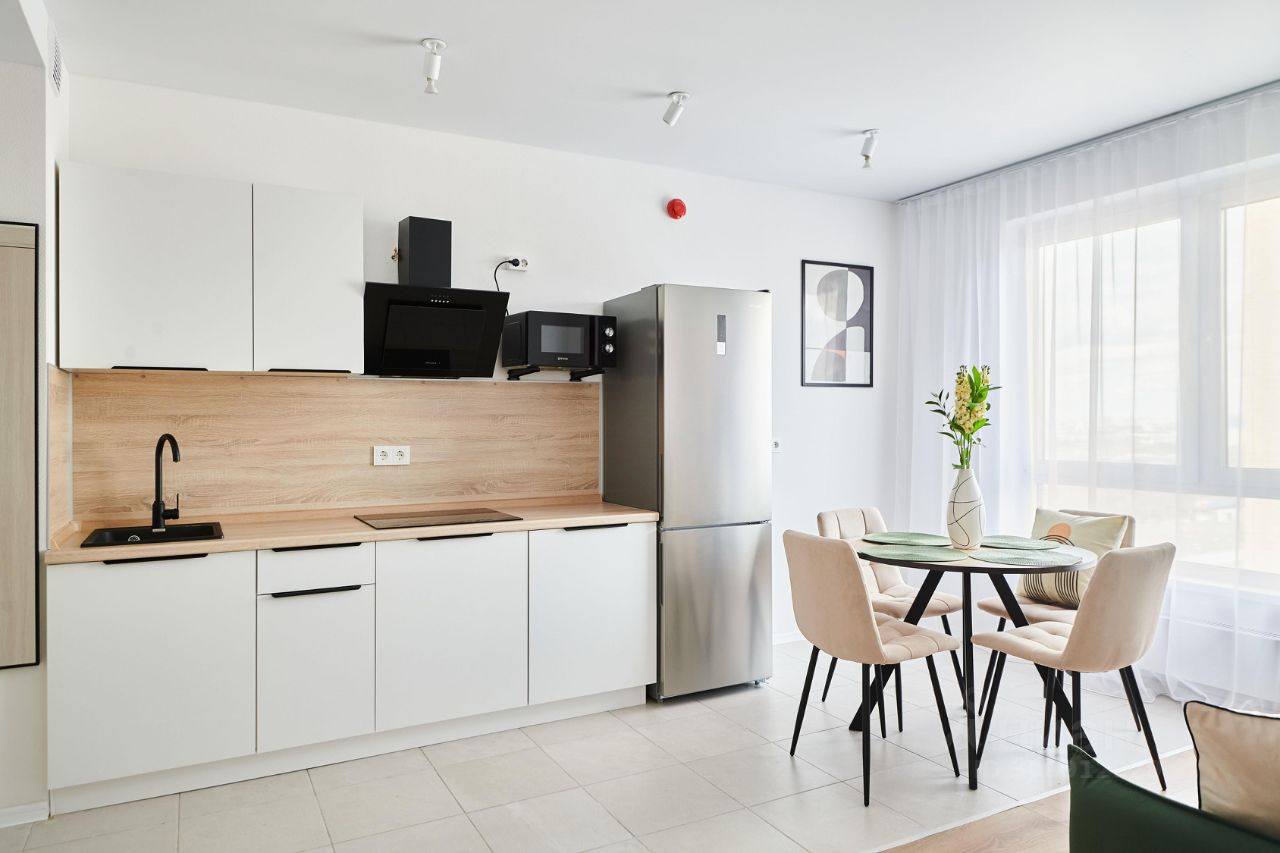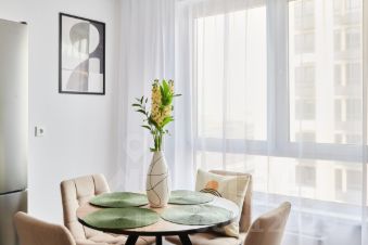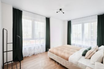 Квартира полностью укомплектована мебелью, техникой: кондиционер, стиральная машина, микроволновая печь, холодильник, плита, диван, два шкафа, две кровати.