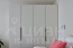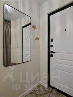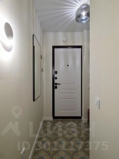 Зона прихожей оборудована эргономичным местом хранения до потолка. Стоит пуфик, чтобы присесть. И зеркало чтобы полюбоваться на себя.