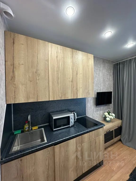 - Кухня с холодильником, плитой, микроволновкой, чайником и посудой.