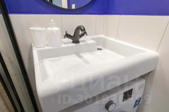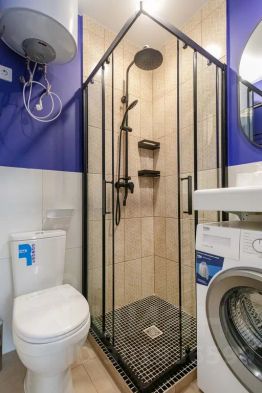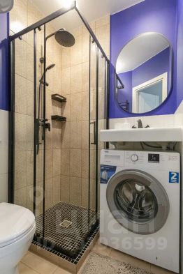 Ванная комната в квартире-студии оборудована современной душевой кабиной и стиральной машиной, что обеспечивает максимальный комфорт при выполнении гигиенических процедур и стирке белья.