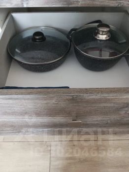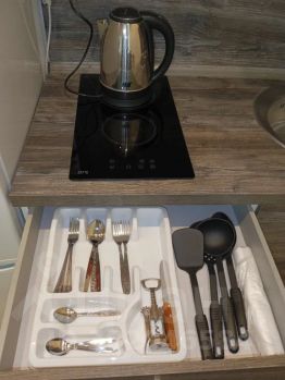 - Оборудованный кухонный гарнитур со всей необходимой техникой (чайник, микроволновая печь, холодильник), в кухонной зоне встроенная варочная панель, так же имеется посуда для приготовления еды (кастрюля, сковородка), а так же тарелки, бокалы, стаканы, кружки и столовые приборы.