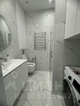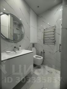В квартире имеется вместительный санузел с просторной душевой кабиной, двумя навесными шкафами, большой тумбой под раковиной, зеркалом с подсветкой и стирально-сушильной машиной.