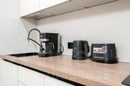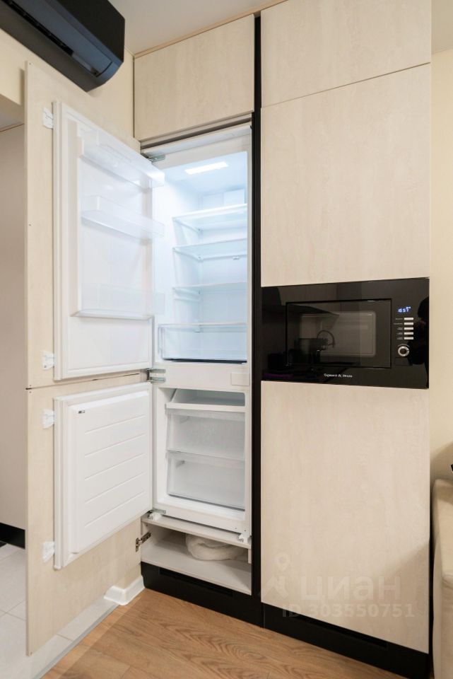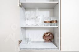 В кухонной зоне установлена варочная панель, чайник, микроволновка, холодильник, фильтр для воды, а также имеется необходимая для приготовления и приёма пищи посуда.