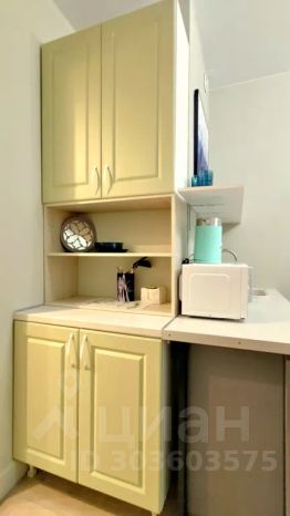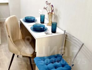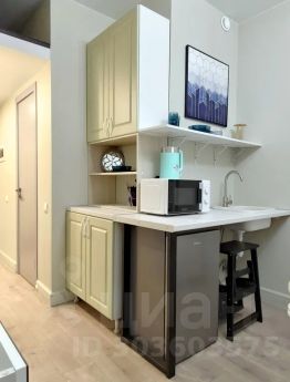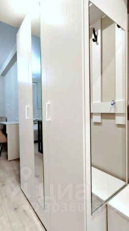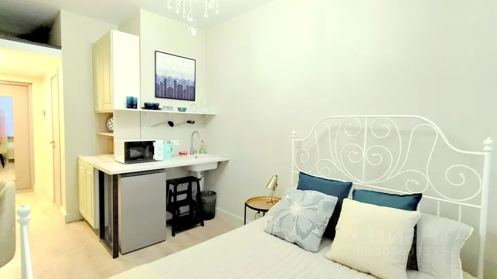 В студии двуспальная кровать с ортопедическим матрасом, туалетный столик с зеркалом, два кресла, wi-fi, барный стул, кухонная мебель с техникой и посудой, вместительный шкаф с полками и продольной штангой, вешалка, обувница, есть антресоль для крупногабаритных вещей.