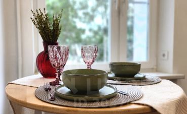 - Всё необходимое для приготовления и приёма пищи: полный набор посуды и техники.