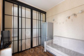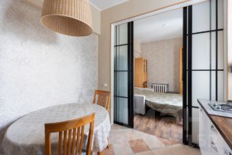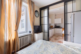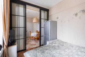 Комната от кухни отделена раздвижной межкомнатной перегородкой с матовым стеклами.