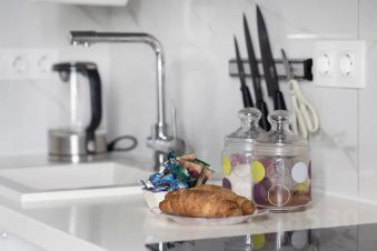 Вся современная техника, включая посудомоечную и стиральную машины, утюг, фен, гладильная доска. Теплые полы, посуда, фильтр с чистой питьевой водой, свежие полотенца и постельное белье, зубные щетки, шампунь, гель, чай, кофе, сахар, конфеты.