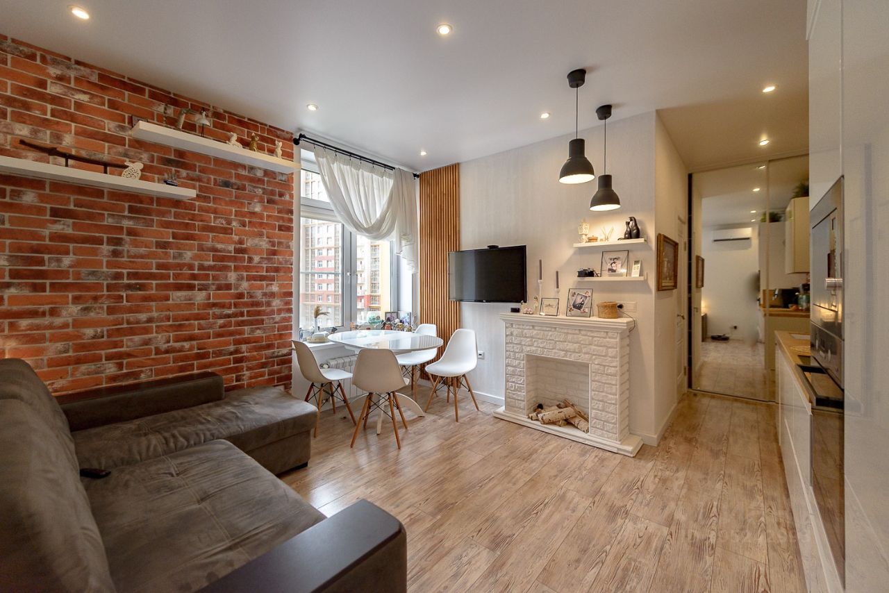 Функциональная планировка: кухня-гостиная 15 кв.м., спальня 8 кв.м., детская 12 кв.м.