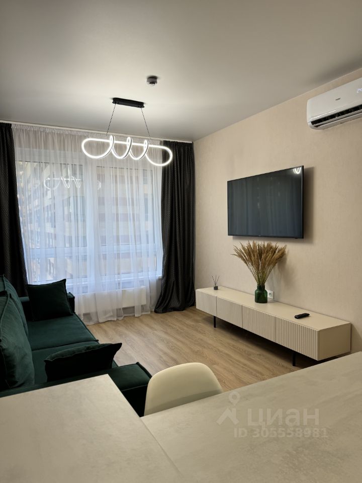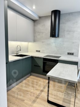Квартира состоит из двух комнат: кухня-гостиная и спальня. Зона кухни - встроенный кухонный гарнитур: холодильник, электрическая варочная поверхность с духовым шкафом и вытяжкой, . Обеденная зона представлена барной стойкой. В зоне гостиной большой комфортный диван (полноценное двухспальное место) и телевизор 55. Все окна выходят во двор, много света в квартире.