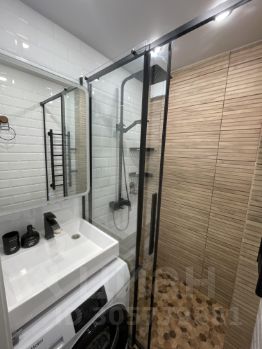 В ванной герметичная душевая кабина с тропическим душем и новая стиральная машина.