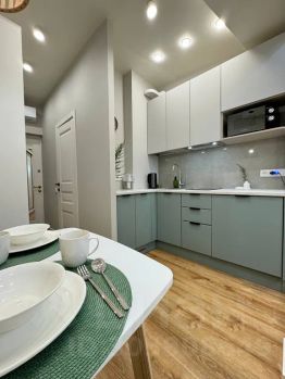 One-time апартаменты встретят вас полностью оборудованной и укомплектованной всем необходимым: плита, холодильник, микроволновая печь, электрочайник, фен, утюг, посуда, качественное постельное бельё, бесплатный