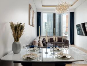 Двухкомнатный апартамент в башне "Neva Towers" Libra 70 кв. м. На 38 этаже с панорамными окнами и видом на башни сити и городскую панораму. Кухня гостиная, полностью укомплектованная бытовой техникой, посудой и бокалами - микроволновка, духовка, плита, холодильник, морозильник, пространство для хранения. Кондиционер, smart tv, wifi, дизайнерская мебель. В спальне двуспальная кровать, в гостиной раскладывается диван. Включены тапочки, халаты, чай, кофе, гигиенические и зубные наборы.