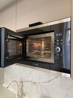- Кухонный блок: варочная панель (2 конф), вытяжка, встроенная микроволновка с грилем), холодильник.