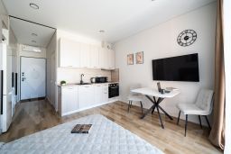 кондиционер, телевизор smart TV со всеми необходимыми приложениями и браузером, WiFi, фен, утюг, гладильная доска, сушилка для вещей, стиральная машина, большое количество мест для хранения вещей.