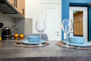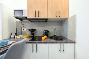 Кухня оборудована всеми необходимыми приборами для приготовления еды: есть электрический чайник, плита, холодильник и микроволновка.