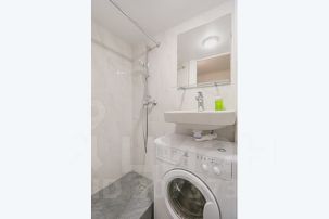 На втором этаже расположилась компактная и уютная спальня с двуспальной кроватью и прикроватными светильниками. Совмещенный санузел включает в себя туалет, душевую кабиной, раковину с зеркалом и стиральную машину, компактно расположившуюся прямо под раковиной.