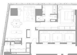 Изолированная мастер-спальня с ванной комнатой. Просторная гостиная совмещена с кухней. Дополнительный гостевой санузел.