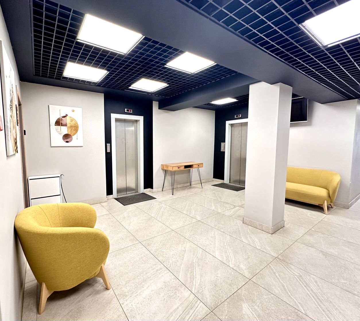 Приятная входная группа с охраной и красивый лифтовой холл на этаже.