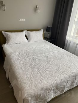 В зоне спальни размещена двуспальная кровать с ортопедическим матрасом, предусмотрены новые подушки, одеяло, новое постельное белье, а также плед и декоративные подушки.