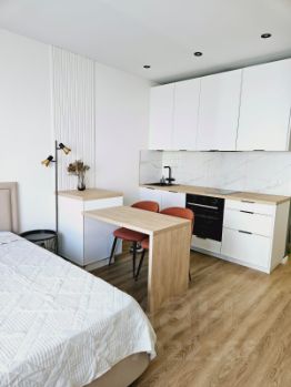 Кроме того, квартира полностью укомплектована новой мебелью, имеет полноценную кухню, входную зону с удобным и вместительным шкафом, зеркалом и комфортным сидением, столовую зону с интересным решением в реализации стола, спальную зону с удобной кроватью 200 на 140 (с подъемным механизмом) и качественным матрасом, а также высоким трехстворчатым шкафом и тумбой для хранения.