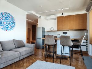 В квартире выполнен дизайнерский ремонт. Уютная стильная кухня - гостиная и атмосферная спальня. Кухня оборудована всей необходимой техникой: холодильник, посудомоечная машина, духовой шкаф, печь СВЧ, кондиционер. Санузел совмещенный оборудован европейской сантехникой. В прихожей расположен вход в изолированную кладовую с дополнительным шкафом для вещей, стиральной машиной. Высокие потолки 3.2 метра. Все окна с панорамным видом на парк.