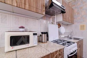 - газовая плита, микроволновка, духовка, вытяжка, чайник, холодильник;