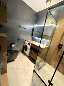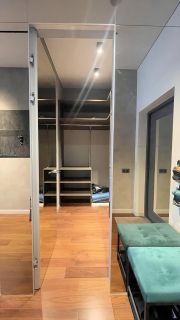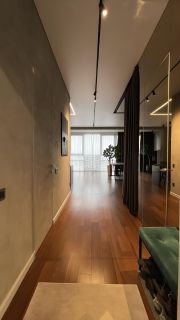 Пространство грамотно зонировано и включает в себя кухню, гостиную-спальню и рабочую зону. Интерьер выполнен по авторскому дизайн-проекту. Квартира оснащена всей необходимой мебелью, включая раскладной диван с полноценным двуспальным местом и ортопедическим матрасом, а также вместительной гардеробной комнатой. Кухня укомплектована встроенной бытовой техникой ведущих европейских брендов (Bosch, AEG, Siemens).