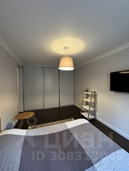 В комнате двуспальная кровать с ортопедическим матрасом и вместительный встроенный шкаф во всю стену.
