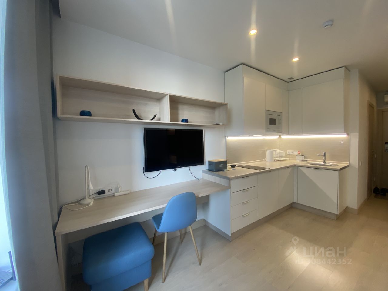 В квартире сделан евроремонт, что обеспечивает современный и стильный интерьер. Пространство студии грамотно организовано: есть вся необходимая мебель как в комнате, так и на кухне. Для комфортного проживания установлена бытовая техника: кондиционер, холодильник, телевизор и стиральная машина. В ванной комнате установлена душевая кабина.