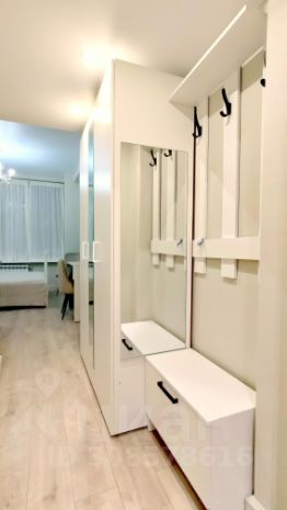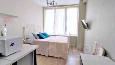 В студии двуспальная кровать с комфортным, как отмечают гости, ортопедическим матрасом, обеденный стол, стул, кресло, туалетный столик с зеркалом, wi-fi, вместительный шкаф с продольной штангой и ящиками, вешалка, обувница, есть антресоль для крупногабаритных вещей, утюг, отпариватель, гладильная доска.
