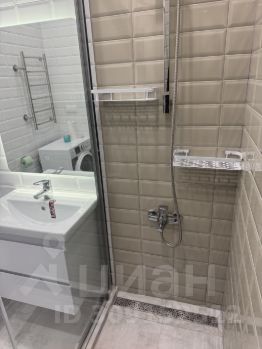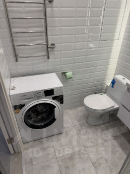 Просторная ванна с душевой кабиной и стиральной машиной.