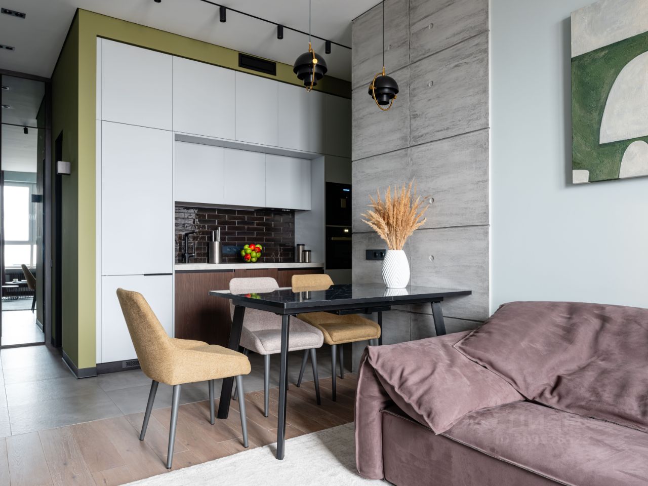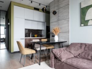 - Кухня-гостиная: современный кухонный гарнитур со встраиваемой бытовой техникой (духовой шкаф, холодильник, варочная панель, посудомоечная машина, кофе машина). В гостиной расположен обеденный стол, диван, выполненный по индивидуальному заказу, телевизор, винный шкаф.
