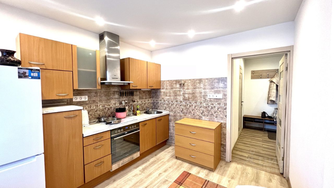 В кухне - стол+2 стула, холодильник, чайник, кухонный гарнитур, в котором: варочная панель, духовой шкаф, вытяжка.