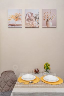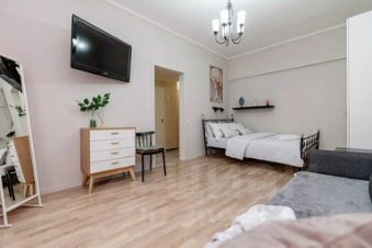 В квартире для удобного проживания имеется современная мебель и техника: двуспальная кровать и двуспальный раскладывающийся диван, бытовая техника, скоростной Wi-Fi, спутниковое ТВ, стиральная машина, гладильная доска, сушка, оборудованная кухня, полный комплект посуды для приготовления и приёма еды.