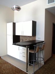 В кухонной зоне- холодильник, варочная панель, барная стойка
