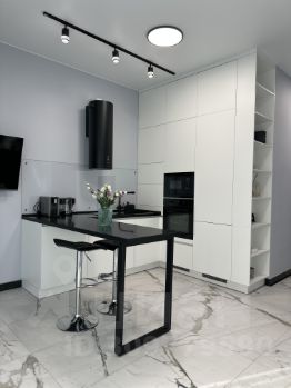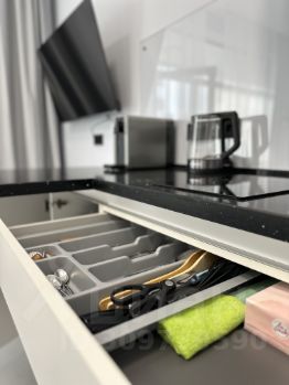 На кухне вся необходимая техника (СВЧ-печь, духовой шкаф, фильтр очистки питьевой воды, индукционная плита, капсульная кофемашина, холодильник, эл. чайник, посуда и приборы )