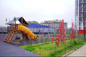 Закрытая домовая территория без машин с множеством спортивных и детских площадок, качелей, горок и тренажёров для взрослых и детей.