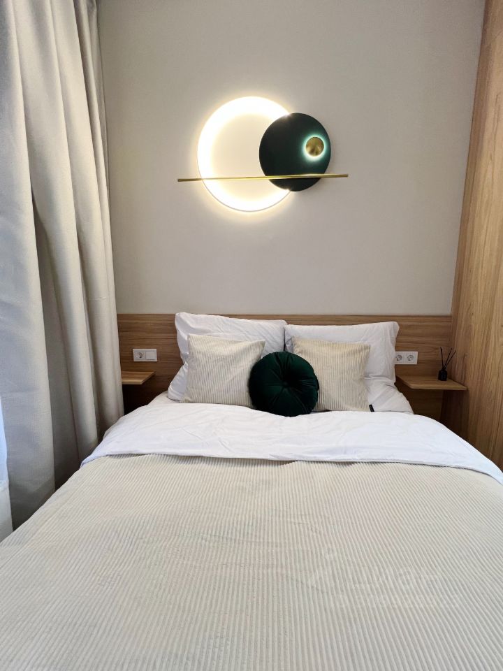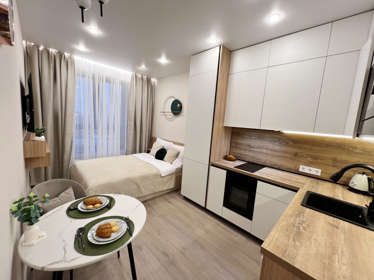 О КВАРТИРЕ: Шикарный новый ремонт, встроенная мебель на заказ! Для вашего комфорта: кондиционер с wi fi управлением с телефона, встроенные большой холодильник, посудомоечная машина и прочая кухонная техника, стиральная машина на 5 кг загрузки, шторы блекаут. Полноценная двуспальная кровать с матрасом Askona. Много мест хранения: кровать с подъемным механизмом, шкаф и кухня до потолка. Несколько сценариев освещения: в зоне кухни отдельные светильники в потолке и подсветка столешницы от сенсорных датчиков; люстра над обеденным столом, в зоне спальни так же отдельно включтся светильники в потолке, подсветка карниза, а так же красивый дизайнерский светильник над изголовьем.