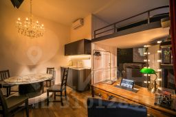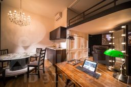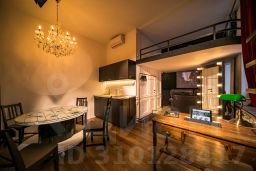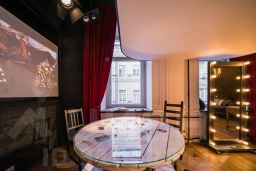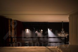 Студия Театр — это признание в любви виду искусства. Темное пространство студии "по щелчку пальцев" пронизывает свет театральных прожекторов, второй ярус округлой формы напоминает бельэтаж в настоящем зрительном зале, мебель на колесах, которую можно расставить именно так, как хочется — интерьер студии словно призывает разбудить в себе внутреннего творца. "Театр" отлично подойдет тем, кто все время находится в поиске и ждет очередной встречи с Музой.