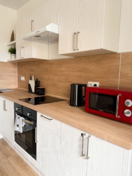 -вся необходимая бытовая техника: ЖК телевизор смарт, большой холодильник,электроплита , кондиционер, духовка, СВЧ, электрочайник