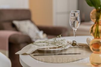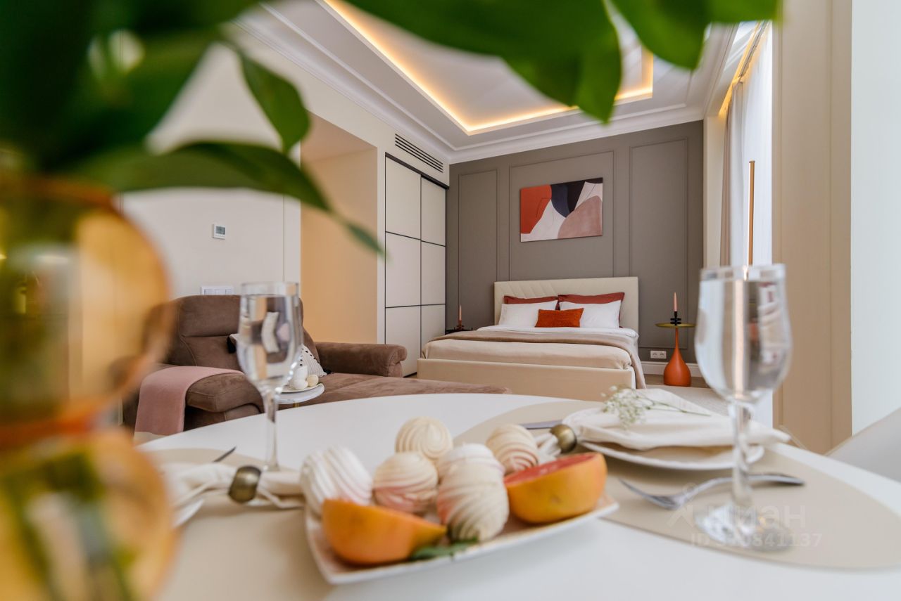 Планировка: просторная комната, в которой предусмотрены двуспальная кровать с ортопедическим матрасом, совмещённый санузел с душевой кабиной, просторный холл с тремя вместительными встроенными шкафами. Квартира полностью меблирована и оснащена всей необходимой бытовой техникой. Предусмотрено много мест для хранения.