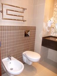 душевая кабина, биде, навесной унитаз.