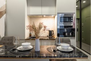 - Полностью оборудованная кухня: холодильник, варочная панель, вытяжка, чайник, набор посуды и столовых приборов, а также чай, кофе и сладости.